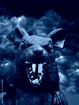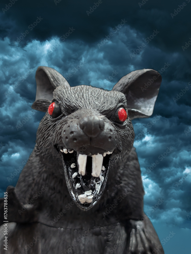 Scary black rat figure with red eyes and fierce expression against a stormy sky background