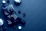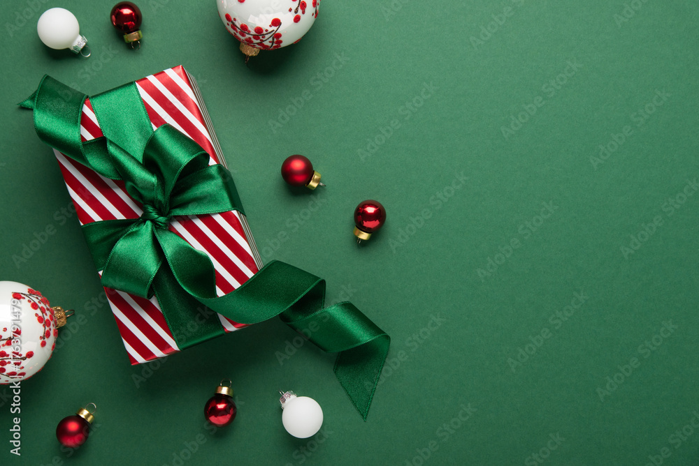 Merry Christmas and Happy Holidays greeting card, frame, banner. New Year. Red Christmas ornaments and gifts, presents on green background top view. Xmas holiday festive theme. Christmas decoration