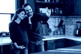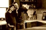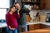 Man hugging his pregnant wife, having fun together making selfies in the last trimester of pregnancy