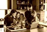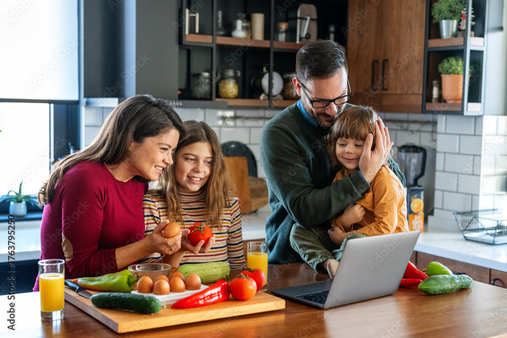 Happy young parents with excited small kids using laptop computer at home. Technology family concept