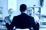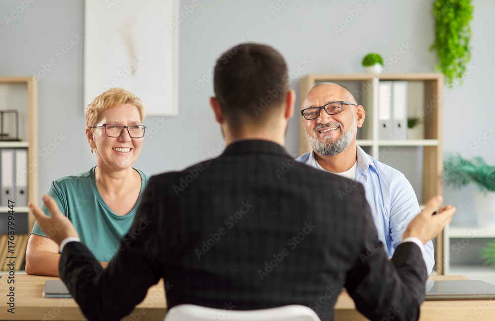Smiling senior couple consults a financial advisor in office, reviewing paperwork and signing documents during a meeting. Male agent consulting elderly clients about investments and insurance.