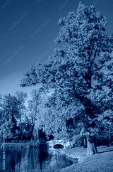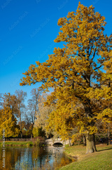 Golden autumn tree in Catherine Park, trees reflected in the water. Pushkin, Saint Petersburg, Russia