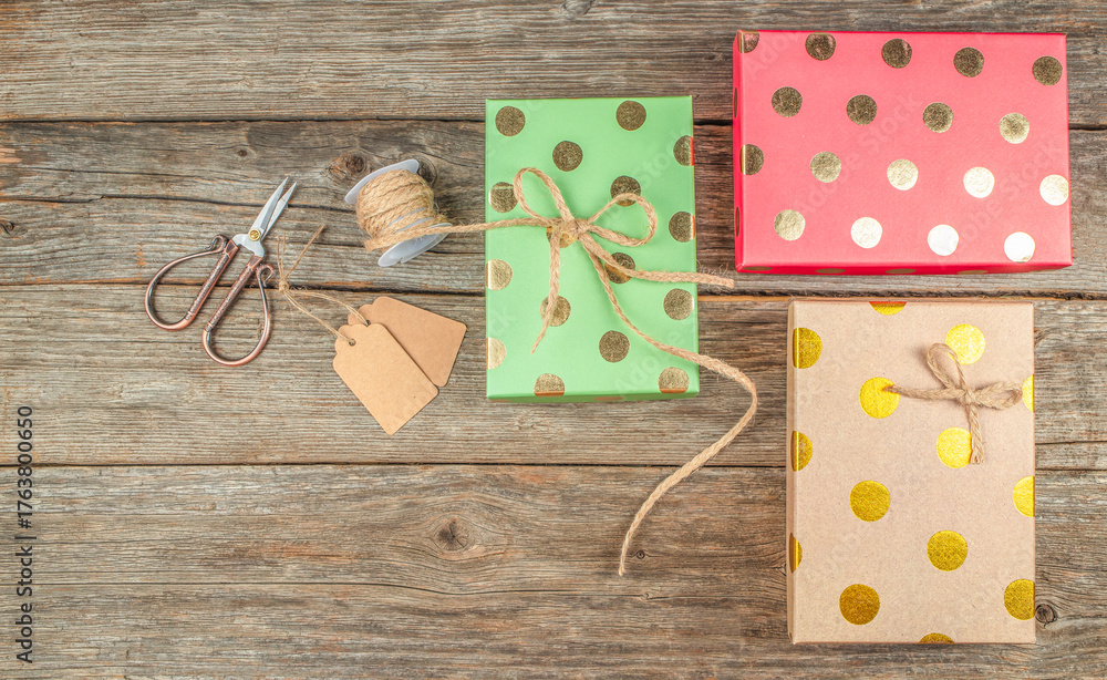 Colorful Christmas gift wrapping with golden polka dot boxes, twine, tags, and scissors on rustic wooden background with copy space