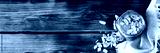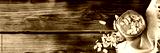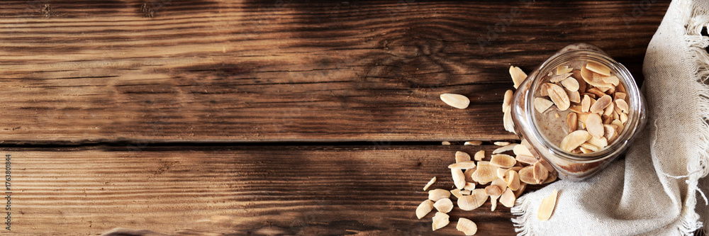 100% Almond butter without sugar in glass jar on wooden background — top view