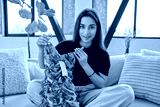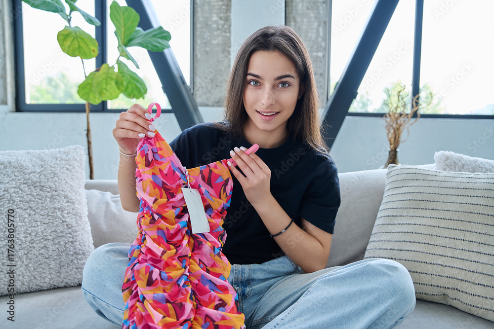 Young woman unpacking cardboard box parcel with online order, looking at new clothes