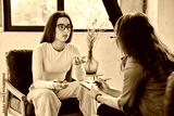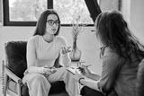 Sad teenage girl student talking with social psychologist, therapist, counselor