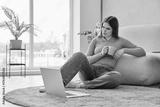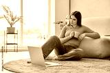 Young relaxed woman with cup using laptop, sitting on floor at home