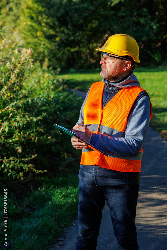 Control inspector checks logging. Ecologist man in workwear. Forestry engineer. Male eco technic with clipboard checking trees. Vertical photo.