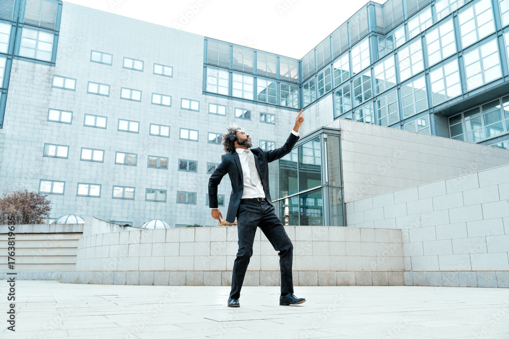 Young entrepreneur business man listening to music and dance