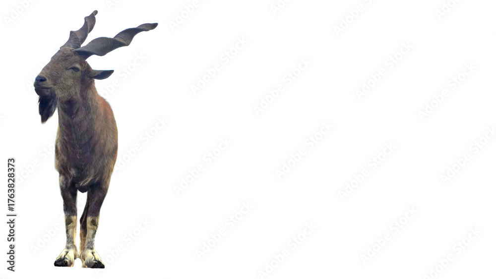 Markhor (Capra falconeri) Isolated on a White Background with Copy Text Space. Majestic Markhor Wild Goat Element for Wildlife Posters, Cultural Themes of Pakistan, and Nature-Inspired Design.PNG File