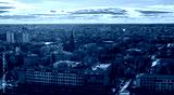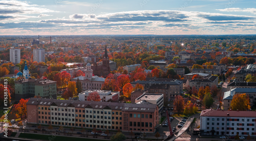 Aerial view of Jelgava, Latvia, in late afternoon light. Holy Trinity Church tower and a blue domed Orthodox church rise among warm autumn trees and city blocks.