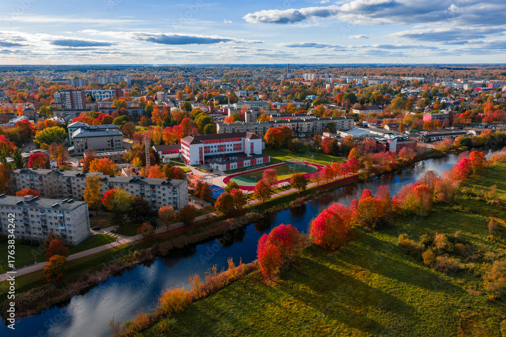 Aerial view of Jelgava, Latvia, in late afternoon fall light, with red and amber trees by a calm river, a red and white school and track, and church spires across the city.