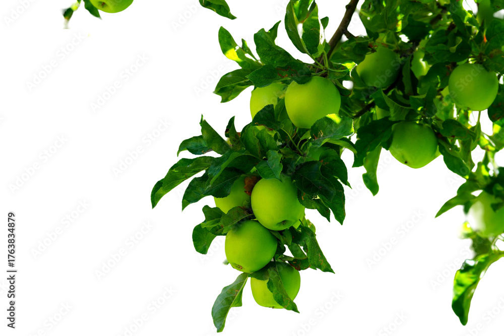 Green Apples on Tree Branch (Malus domestica) Isolated on a White Background with Copy Text Space. Fresh Orchard Fruit Element for Agriculture Posters, Nutrition Themes, and Nature-Inspired Design.PNG