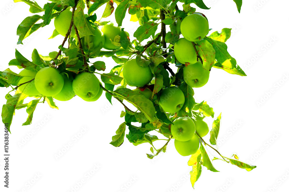 Green Apples on Tree Branch (Malus domestica) Isolated on a White Background with Copy Text Space. Fresh Orchard Fruit Element for Agriculture Posters, Nutrition Themes, and Nature-Inspired Design.PNG