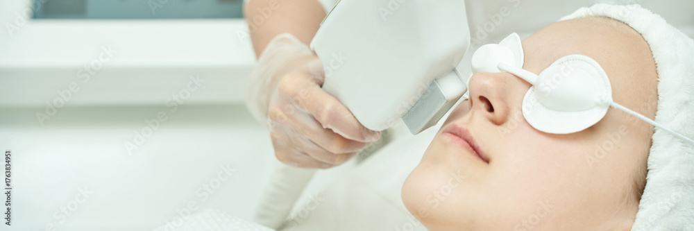 Young caucasian female receiving laser facial treatment at spa for skin rejuvenation.