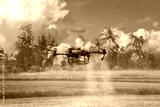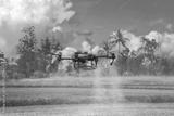 A drone effectively sprays pesticide over a farm field surrounded by lush green trees.