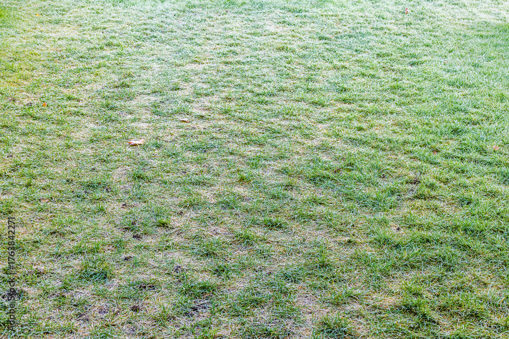 Close up view of frosty green grass on lawn in early morning sunlight during late autumn season. Sweden.