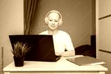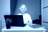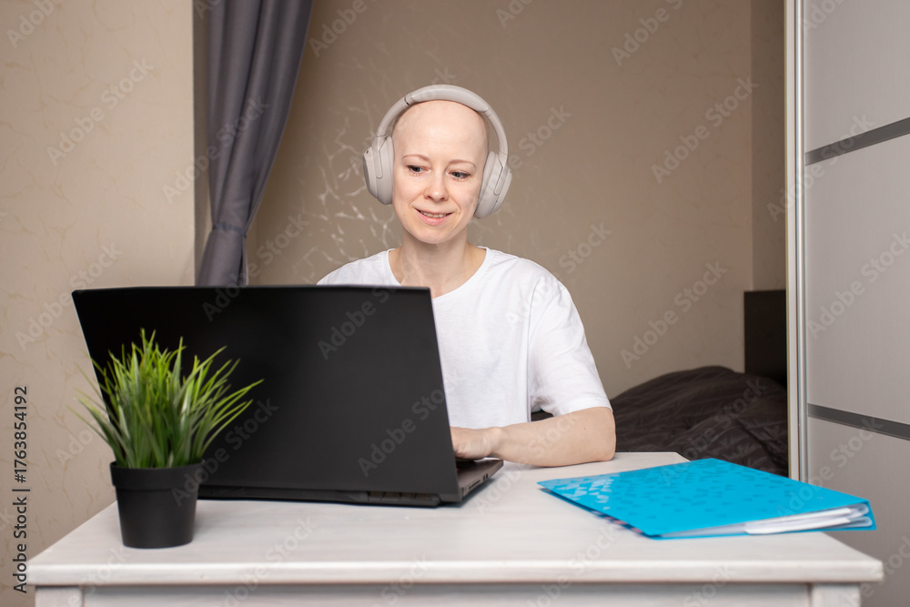 Bald female student with headphones learning online, e-learning platform, distance education from home