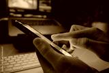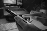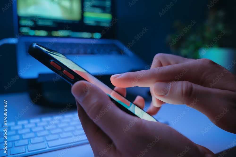 Close-up of persons hand taping on smartphone screen with social media feed at night with laptop on background. Digital addiction and modern online habits.