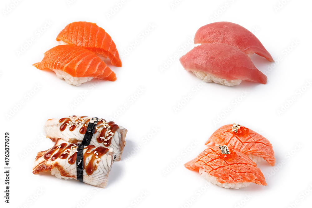 Nigiri sushi assortment with salmon, tuna and eel isolated on white background