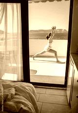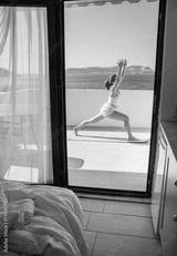 Middle-aged woman doing morning yoga famous Surya Namaskar exercise on sea view terace hotel room, doing Virabhadrasana Pose which making your body more flexible. Healthy routine stretching concept.
