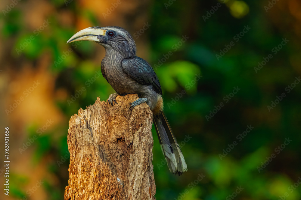 Most Beautiful Malabar Grey Hornbill with blurred background and looking straight at the camera. Clear portrait shot of Malabar Gray Hornbill on a tree perch.