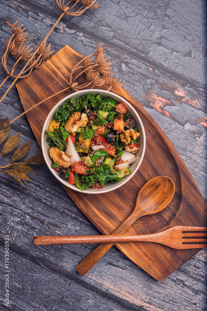 Fresh Quinoa Power salad ,Breakfast power plate for healthy eating top view. Green healthy salad power plate eating. Vagan power bowl salad.