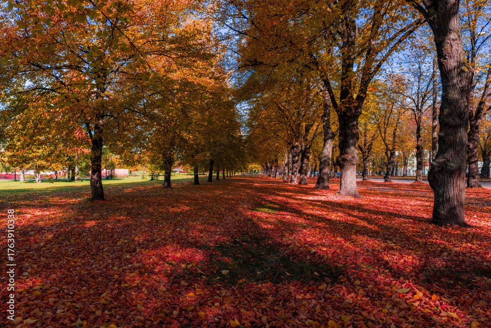 Autumn Landscape - Trees And Orange Foliage In Park At Sunset. Autumn park avenue in Riga, Latvia with long shadows and leaf canopy