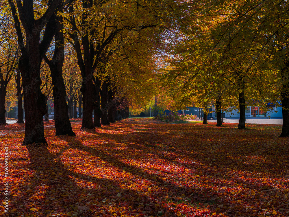 Vibrant orange and yellow maple leaves fall from sun-drenched trees in a park during autumn, creating a beautiful natural carpet on the ground.