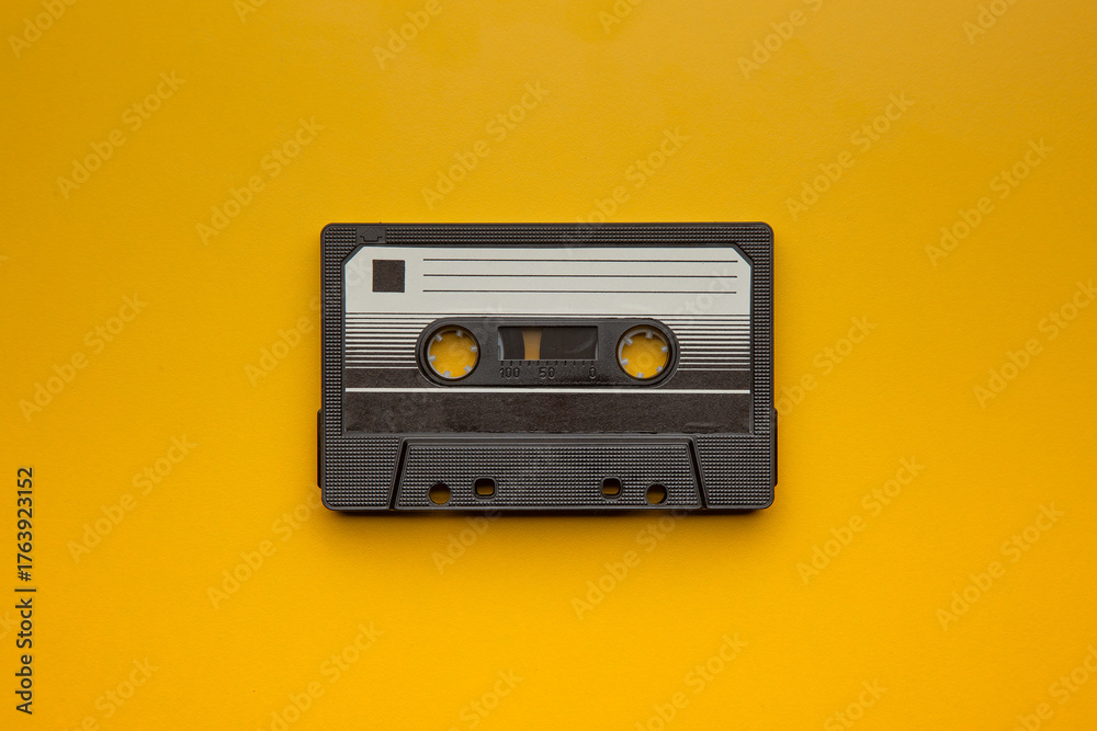 Single vintage black audio cassette tape on bright yellow back