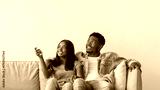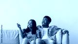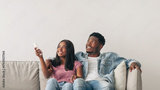 Split System. Satisfied African American woman holding remote control relaxing under the air conditioner, happy millennial black couple sitting on couch in living room, free copy space