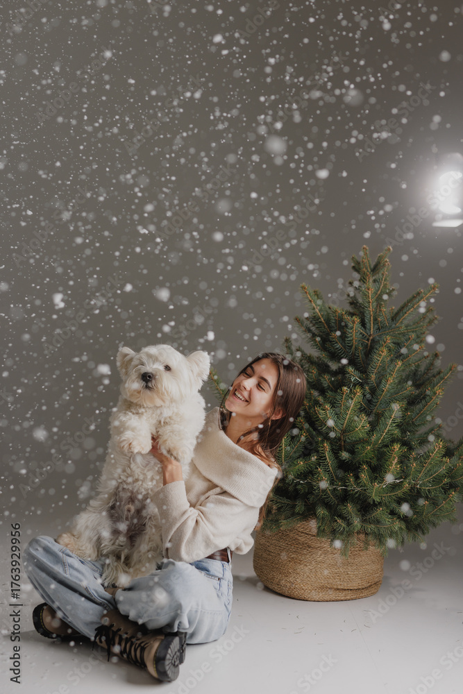 Smiling woman with fluffy white dog by Christmas tree under studio snowfall