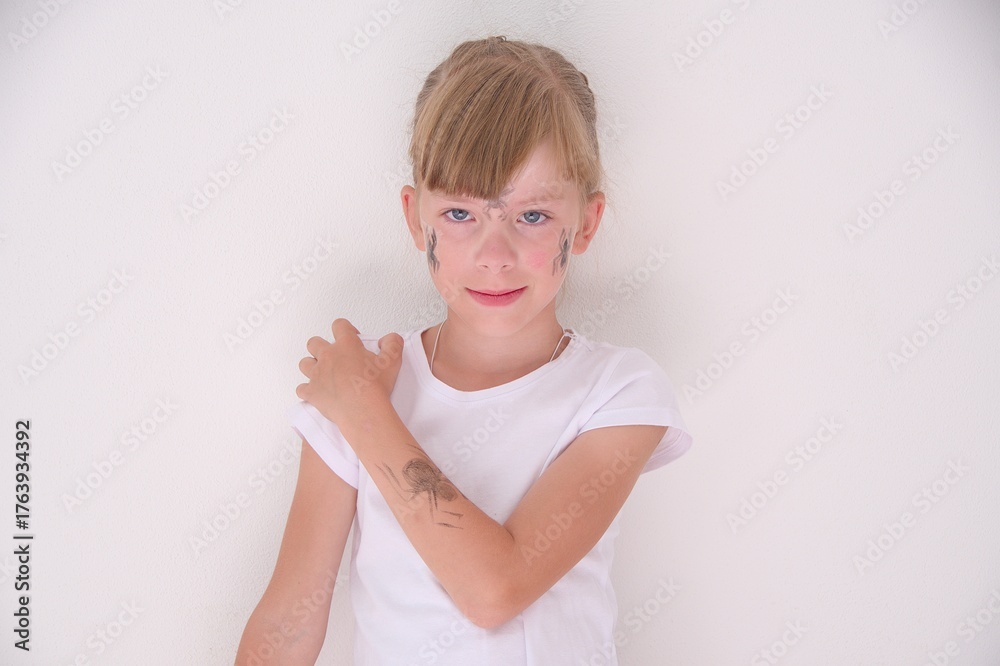 portrait of a girl with a painted face. Spiders painted on the girl's face for Halloween.