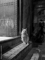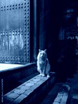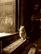 A cat sits in front of a door in the medina of Fez