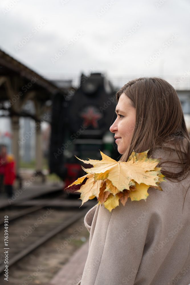Woman with autumn leaves on her shoulder stands near an old steam locomotive at a railway station in Moscow