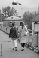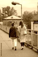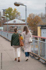 Two women walk outdoors on an overcast autumn day, one wearing a green quilted jacket and brown suede bag with yellow leaves