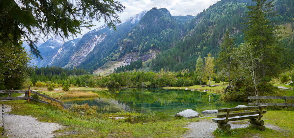 Blick auf den Blausee im Obersulzbachtal in den österreichischen Alpen, mit schöner Spiegelung.