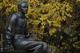 A wooden house in Lermontov's estate in Tarkhany, autumn park with yellow leaves