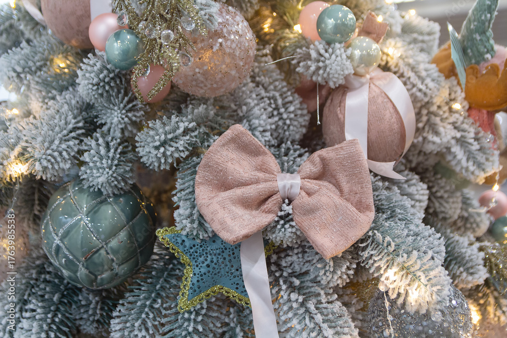 Christmas tree toys and golden balls on snow-covered branches of the Christmas tree