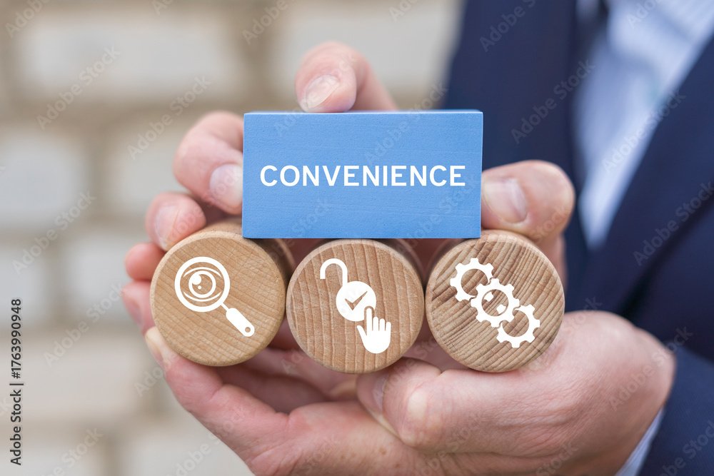 Convenience Business Data Technology concept. Person holding blocks with icons sees the word CONVENIENCE.
