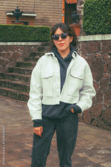 Young Latina girl wearing fall clothes standing in a very relaxed pose, with sunglasses over her eyes.