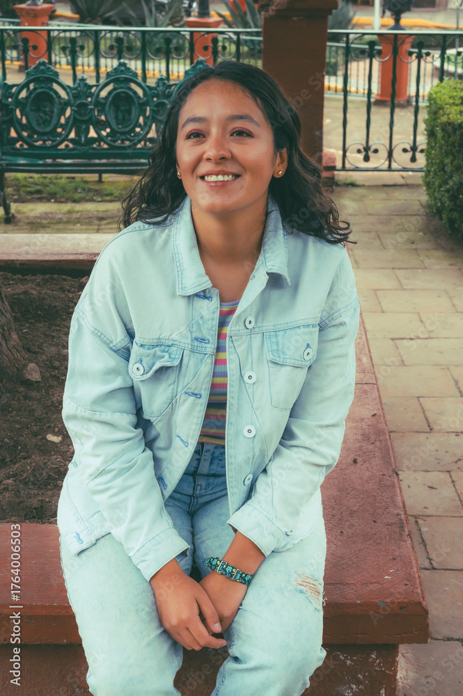 Latina girl wearing denim clothes sitting very happy and smiling on a planter