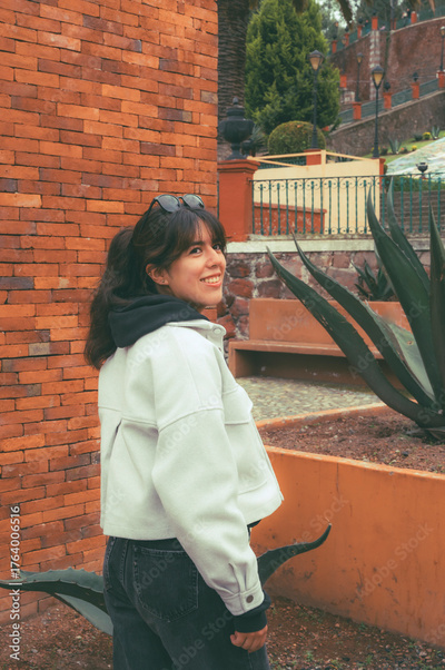 Young Latina girl wearing fall clothes standing in a very relaxed pose, looking back, with her sunglasses on her head
