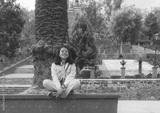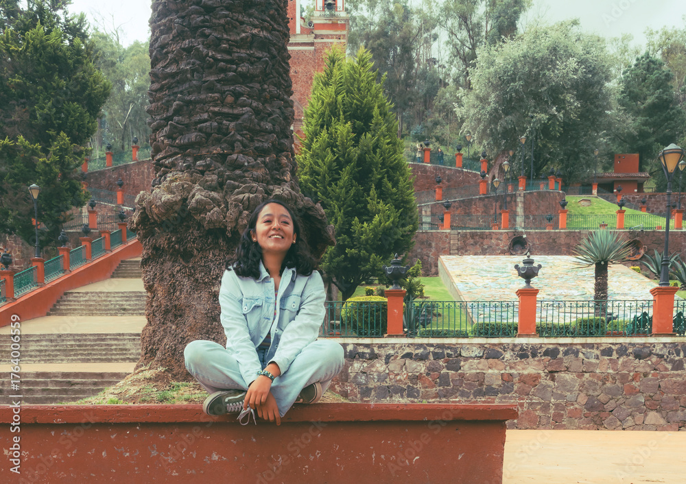 Latina girl wearing denim clothes sitting very happy and smiling on a planter