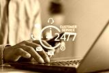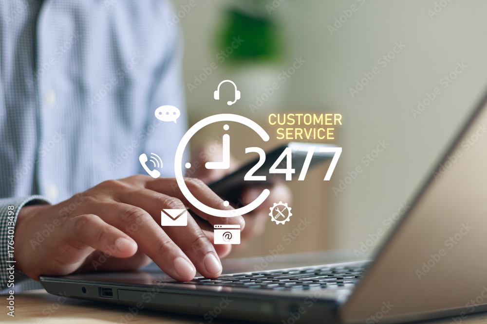 24-7 customer service support concept showing person using laptop and smartphone with digital communication icons, online help desk, business assistance and continuous client support technology.