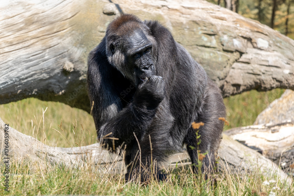 A lowland gorilla feeds in a sunny clearing
