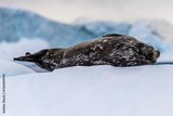 Close-up of a Weddell seal -Leptonychotes weddellii- resting on a small iceberg near Cuverville Island on the Antarctic peninsula