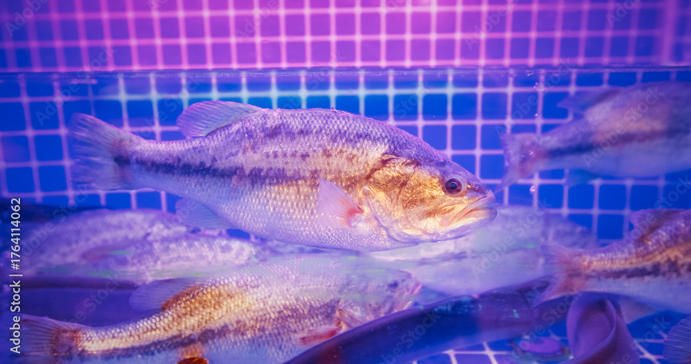 group of fish swim fluidly in an aquarium illuminated by purple light in Chinese cafe