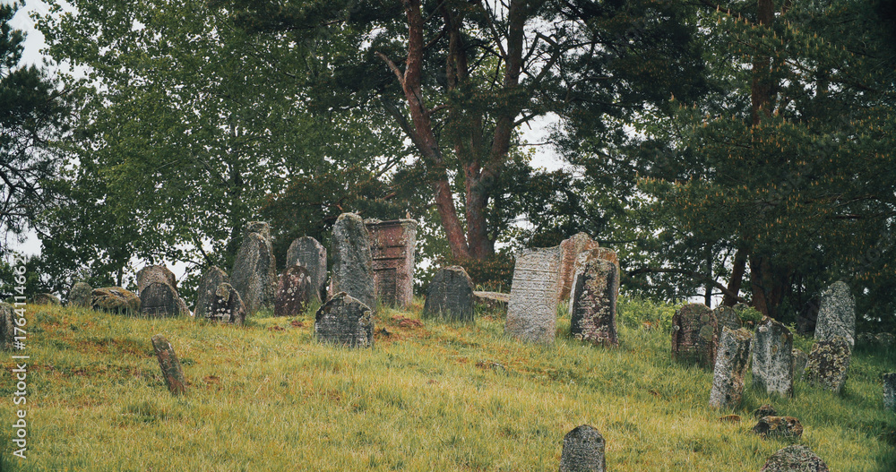 Old ancient Jewish cemetery in summer spring day. green grass and many ancient stones. Headstone Headstones Tombstones jewish grave