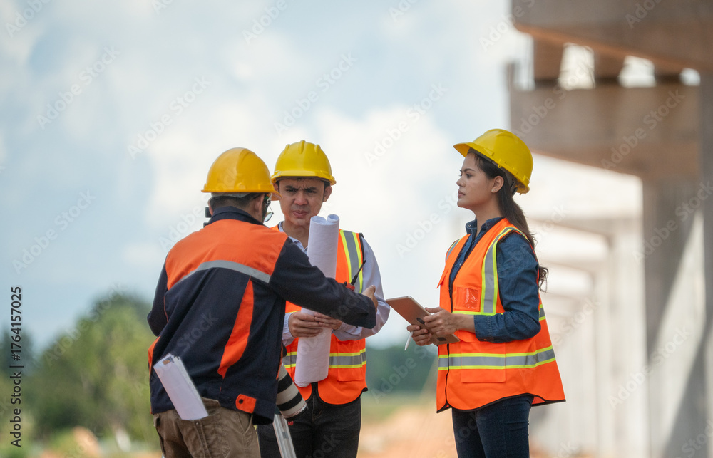 Engineers surveyor wearing helmets and reflective work site surveying blueprint and tablet on hand measurement equipment infrastructure or bridge construction industry.